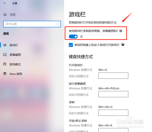 点击“游戏栏”,打开“利用游戏栏录制游戏剪辑、屏幕截图和广播。”