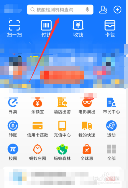 第二:手机进入支付宝首页点击最上方的【搜索框选项】。