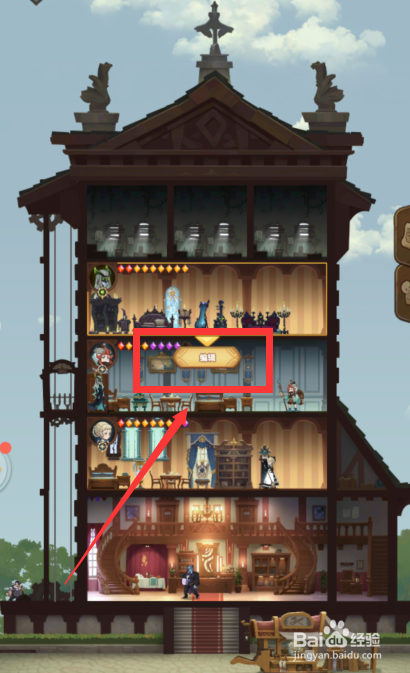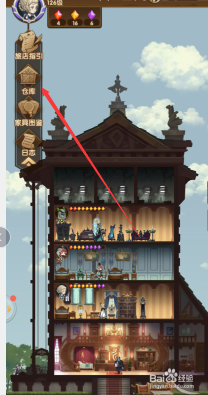 点击左上角的【酒店指引】选项点击【仓库】按钮。