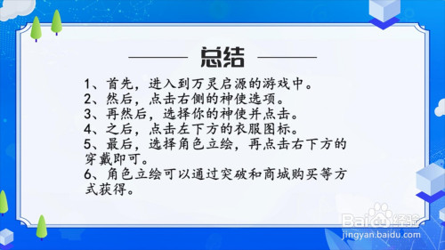 工具/原料演示手机:黑鲨3;游戏版本:0.36.1;方式/步骤1首先,进入到万灵启源的游戏中。2然后,点击右侧的神使选项。3再然后,选择您的神使并点击。4之后,点击左下方的衣服图标。5最后,选择脚色立绘,再点击右下方的穿戴即可。6脚色立绘可以经由过程冲破和商城采办等体例获得。总结11、首先,进入到万灵启源的游戏中。2、然后,点击右侧的神使选项。3、再然后,选择您的神使并点击。4、之后,点击左下方的衣服图标。5、最后,选择脚色立绘,再点击右下方的穿戴即可。6、脚色立绘可以经由过程冲破和商城采办等体例获得。
