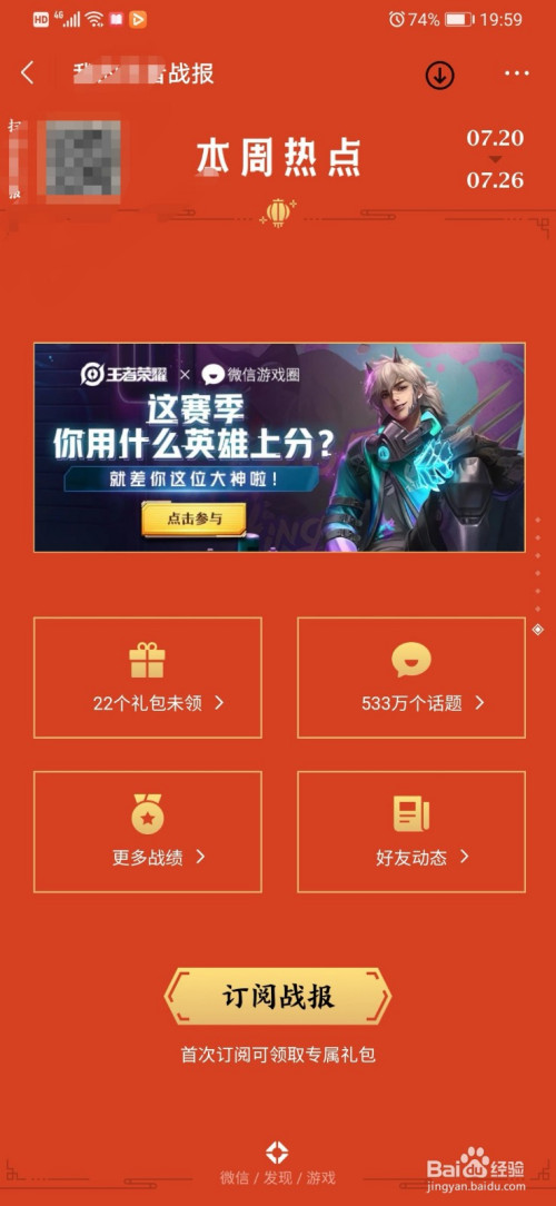 在发现傍边,进入到我们的游戏,然后在游戏界面就可以看到我们王者的处所有一个每周战报。