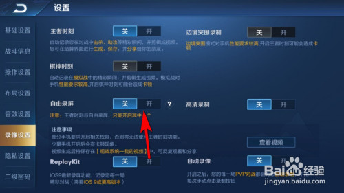 在录像设置中,找到自由录屏,点击滑动按钮,设置为开启状况。