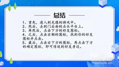 工具/原料演示手机:黑鲨3;游戏版本:0.6.2;方式/步骤1首先,进入到光遇的游戏中。2然后,去到门后面的石头平台上。3再然后,点击下方的老友图标。4之后,点击右侧的图标,找到您的老友图标并点击。5最后,点击右下方的图标,再点击下方简直定图标,即可传送到老友身边。总结11、首先,进入到光遇的游戏中。2、然后,去到门后面的石头平台上。3、再然后,点击下方的老友图标。4、之后,点击右侧的图标,找到您的老友图标并点击。5、最后,点击右下方的图标,再点击下方简直定图标,即可传送到老友身边。