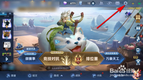 进入王者荣耀首页面,找到箭头所指的设置,进入设置页面。