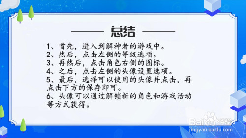 工具/原料演示手机:黑鲨3;游戏版本:3.0;方式/步骤1首先,进入到解神者的游戏中。2然后,点击左侧的品级选项。3再然后,点击脚色右侧的图标。4之后,点击左侧的头像设置选项。5最后,选择可以利用的头像并点击,再点击下方的保留即可。6头像可以经由过程解锁新的脚色和游戏活动等体例获得。总结11、首先,进入到解神者的游戏中。2、然后,点击左侧的品级选项。3、再然后,点击脚色右侧的图标。4、之后,点击左侧的头像设置选项。5、最后,选择可以利用的头像并点击,再点击下方的保留即可。6、头像可以经由过程解锁新的脚色和游戏活动等体例获得。