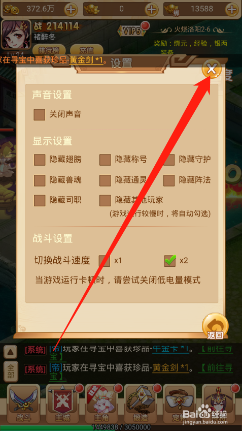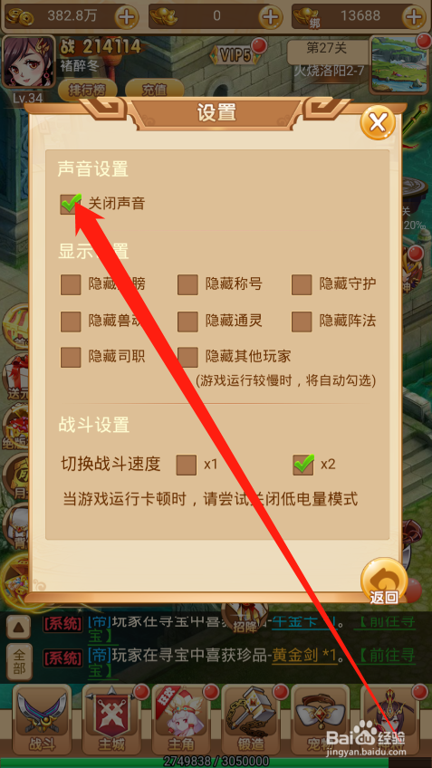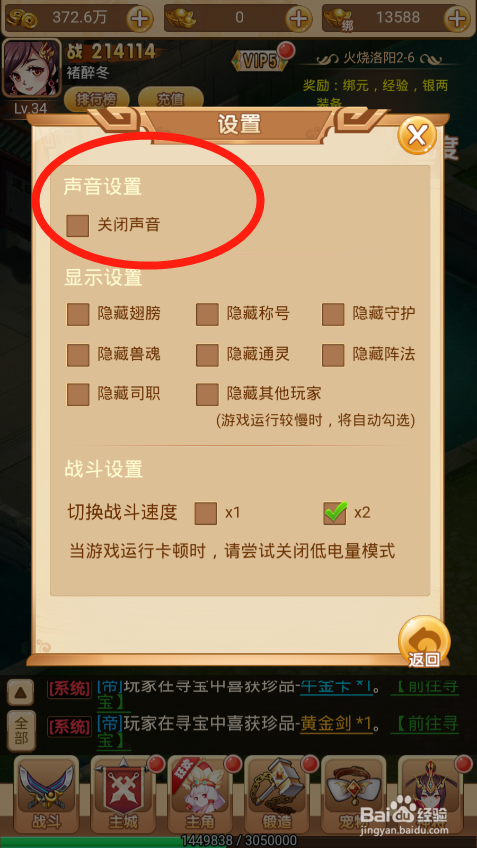 工具/原料冲标的目的地心方式/步骤1点击进入游戏2点击脚色头像,打开脚色信息页面3点击系统设置按钮,进入设置页面4可以看到声音设置的选项5点击选中适合本身,就可以了6点击封闭按钮,就可以利用新的设置,更好的进行游戏了