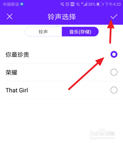 然后选择一首您喜好的歌作为铃声,点击上方的打勾按钮保留。