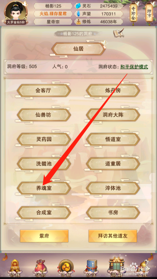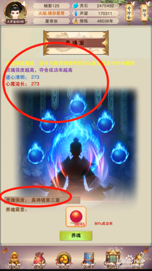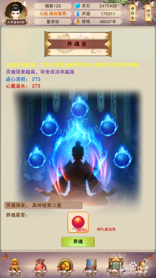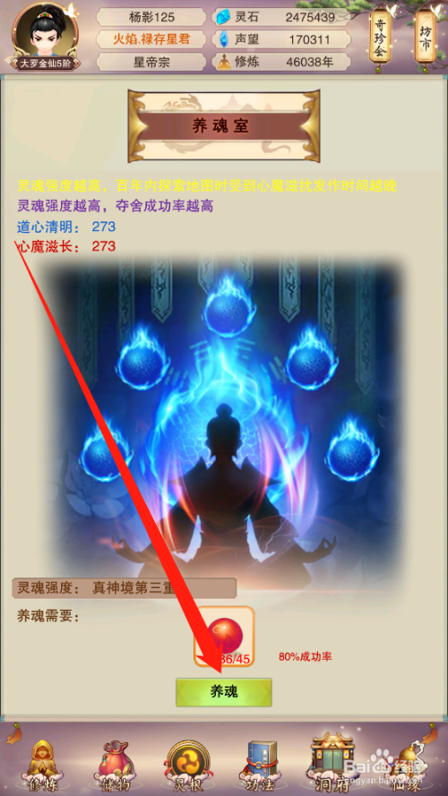 工具/原料手机想不想修真方式/步骤1点击进入游戏2点击洞府按钮3点击仙居按钮,进入仙居4点击养魂室按钮,进入养魂室5可以看到当前魂灵强度品级6点击养魂按钮,就可以利用养魂丹加强魂灵强度注重事项但愿对您有所帮忙,感谢