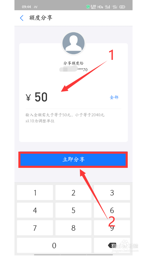 第六步:输入分享额度数值后,点击【当即分享】,之后输入支付密码即可