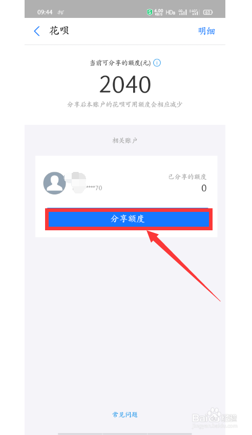 5、选择账户,点击【分享额度】