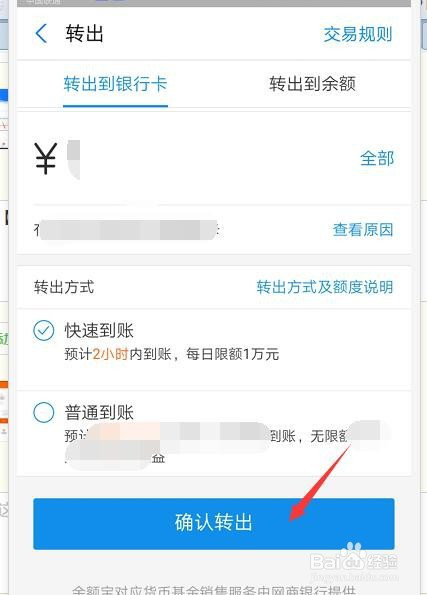 填写转出金额,勾选快速到账,点击确认转出,即可转到绑定的银行卡。