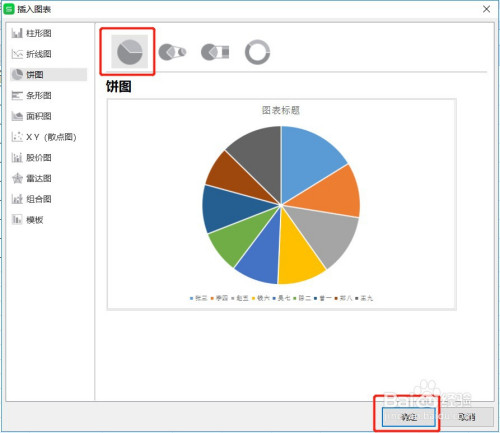 在饼图里面,选择第一个类型,点击下面的【确定】