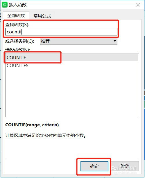 在查找函数框里面输入:countif