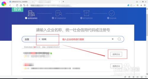 在投诉页面,输入要投诉的企业,按照企业搜刮出门面地址后,在点击选择,详情如下;