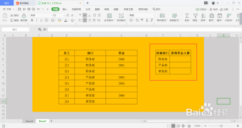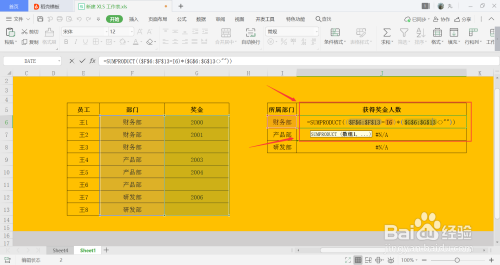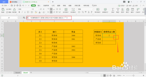 J6单位格中输入计较公式=SUMPRODUCT(($F$6:$F$13=I6)*($G$6:$G$13<>"")),意为,当部分列数据等于I列中数据时,对发放奖金的人数进行统计,不包含节制;