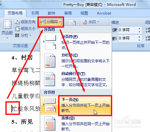 首先仍是定位光标,然后选择页面结构-分隔符-下一页。