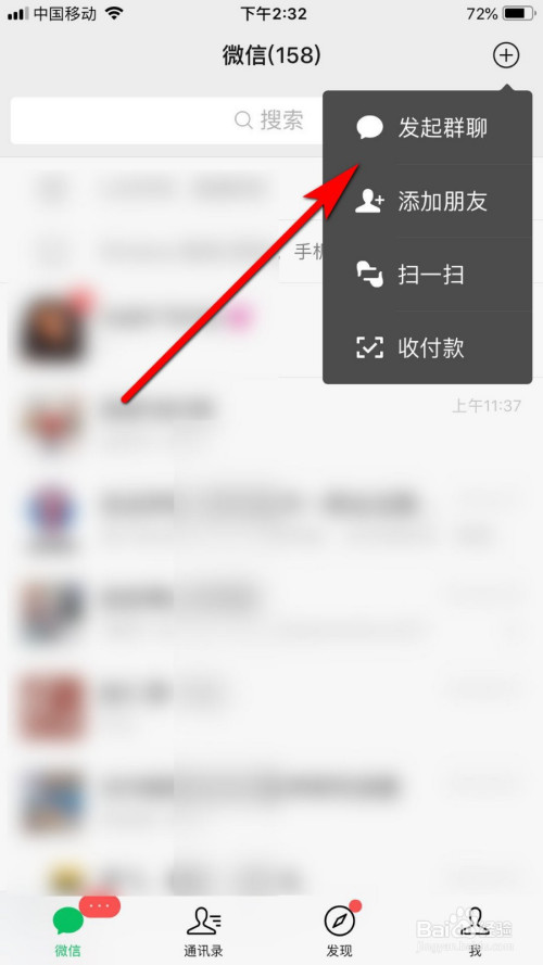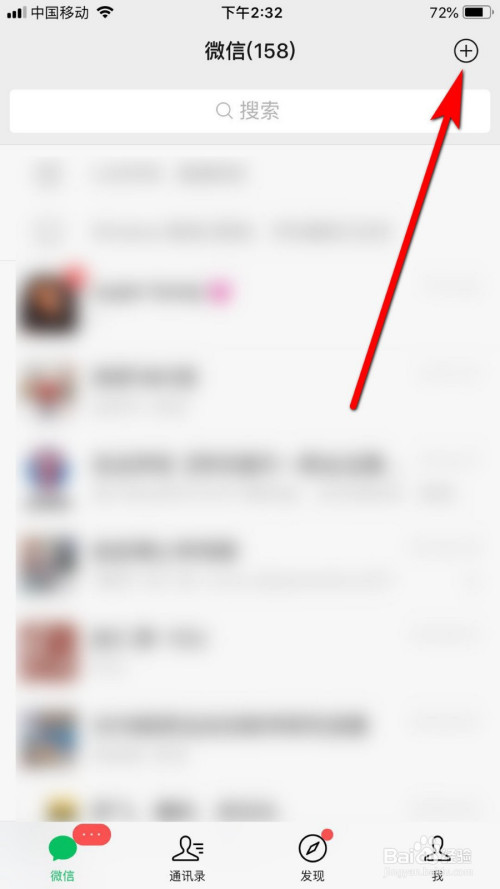 进入微信界面后,找到右上角的+ 符号,点击该菜单。