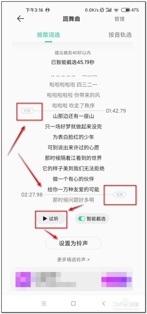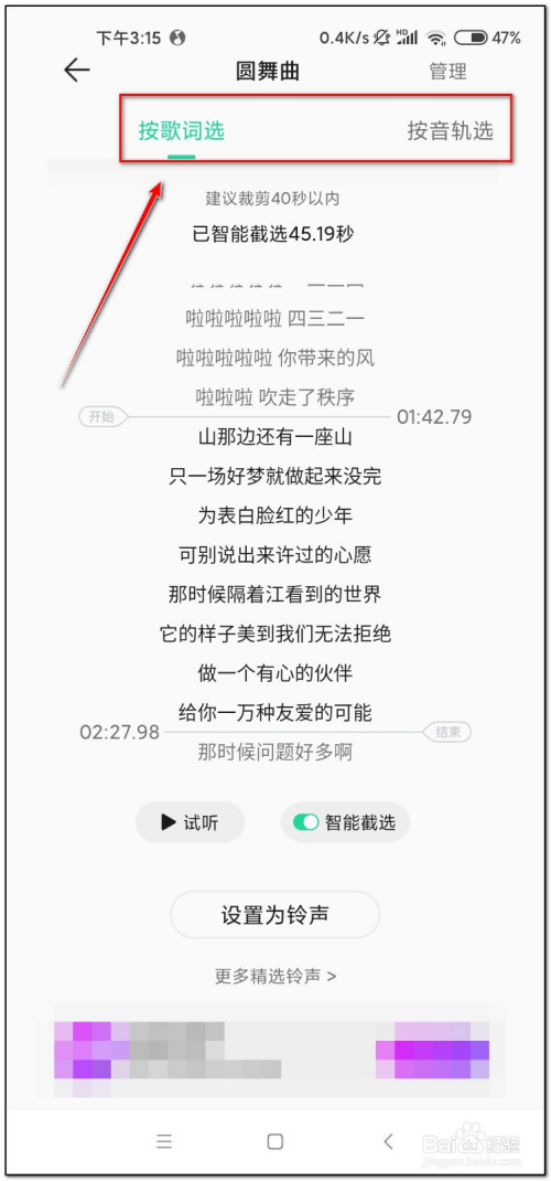 按照歌词选,可以设置铃声起头及竣事位置,试听OK后点击“设置为铃声”
