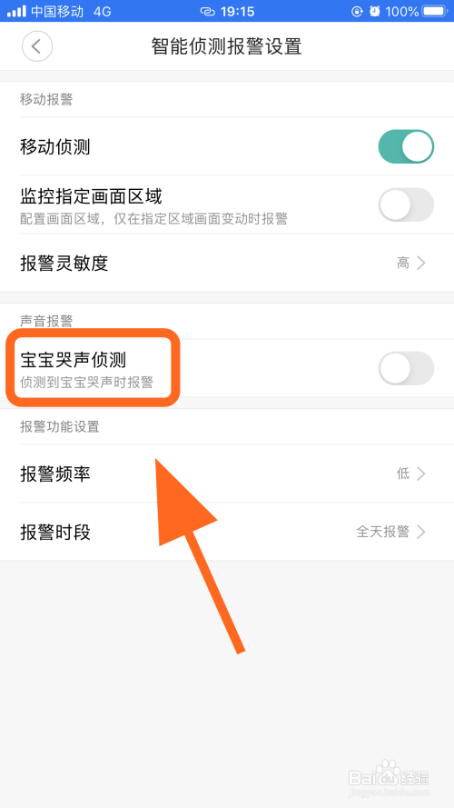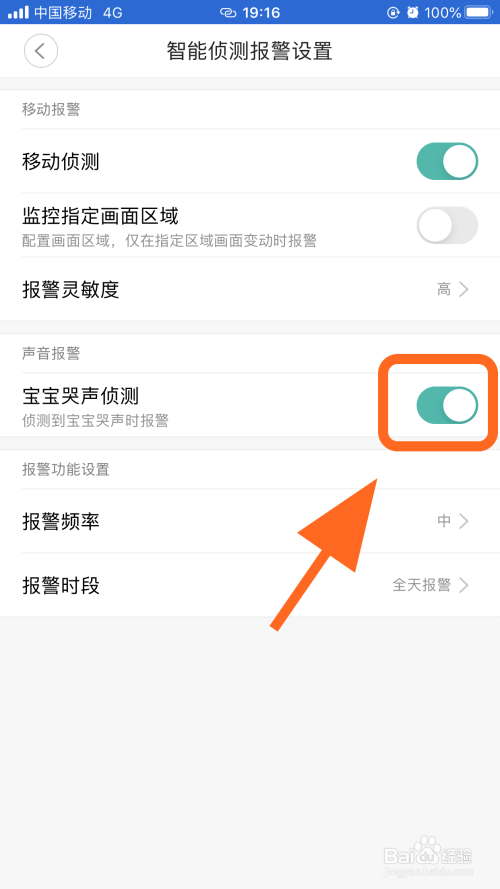 将宝宝哭声侦测后边的开关【打开】,完当作;