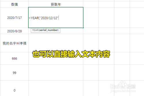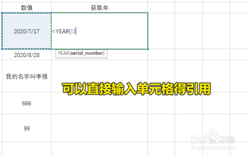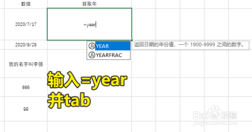 这个时辰就可以输入表达式了,YEAR的参数是需要转化的日期,可以输入单位格的引用