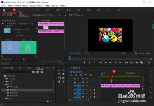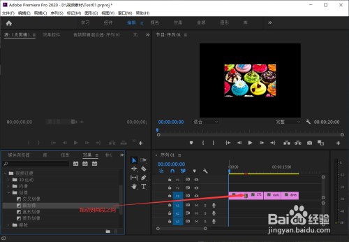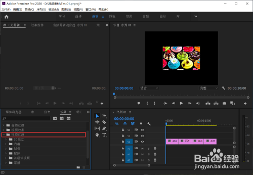 然后,我们点击【视频过渡】,之后就显示出很多视频过渡的结果,我们可以打开并拖动所需的结果到两段视频之间;