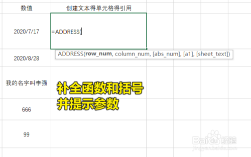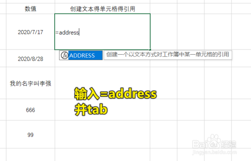 首先打开Excel,在单位格中输入“=ADDRESS”然后按下Tab,只要提醒中第一条是您想要的函数就可以直接按Tab让系统补全
