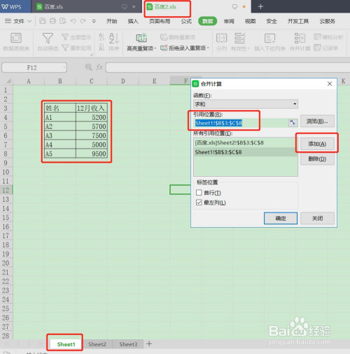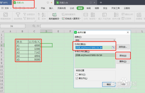 在弹出来的归并计较页面,引用位置拔取第一个表格的数据表,点击【添加】