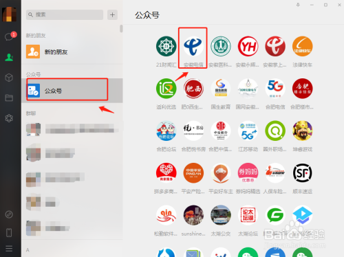 点击公家号进入,微信公家号页面找到安徽电信,点击安徽电信按钮,