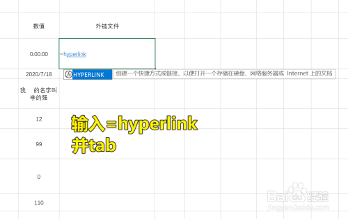 首先打开Excel,在单位格中输入“=HYPERLINK”然后按下Tab,只要提醒中第一条是您想要的函数就可以直接按Tab让系统补全