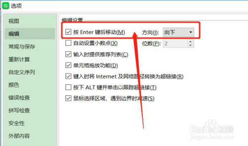在编纂设置里,有一个【按Enter键后移动】的【偏向】下拉框选项,选项默认是标的目的下的