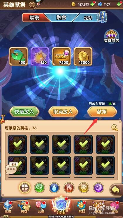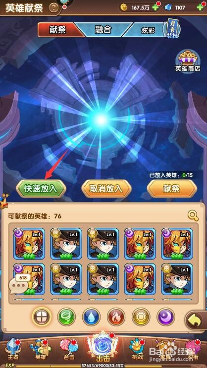 工具/原料漫斗纪元:1.6.8方式/步骤1首先打开漫斗纪元,点击进入游戏。2然后点击英雄融合。3然后点击献祭。4然后点击快速放入。5最后点击右侧献祭即可。总结11、首先打开漫斗纪元,点击进入游戏。2、然后点击英雄融合。3、然后点击献祭。4、然后点击快速放入。5、最后点击右侧献祭即可。