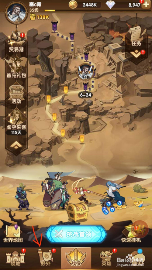 打开手机后进入剑与远征游戏,点击底部的“野外”