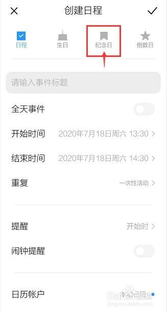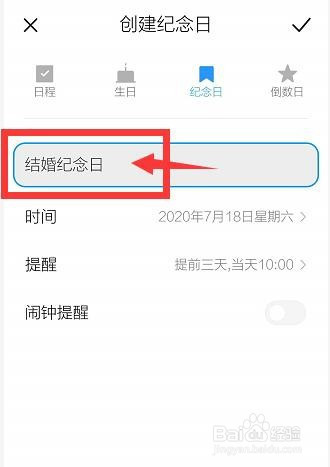 输入【纪念日名称】,设置提醒时候点。