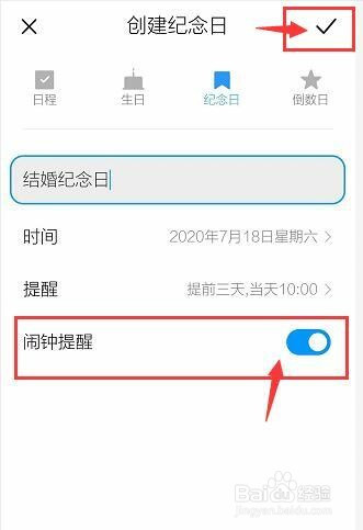 点击【闹钟提醒】后面的按钮,开启闹钟提醒。然后点击右上角【√】即可设置完当作。