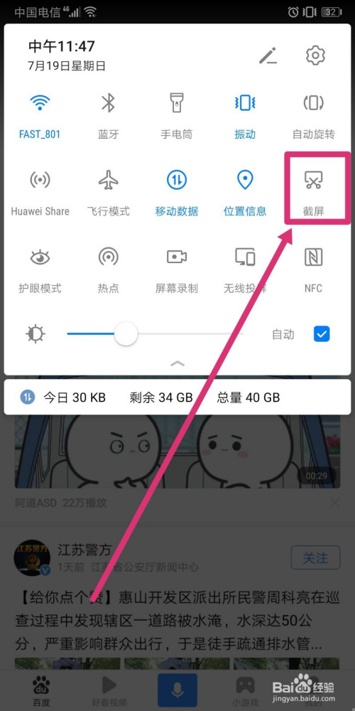 首先标的目的下拉手机的菜单栏,点击【截图】按钮,启动通俗截图模式。