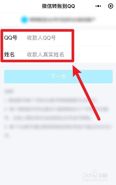 然后输入微信转账到QQ的【QQ号】和【收条目人姓名】。