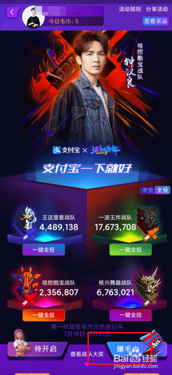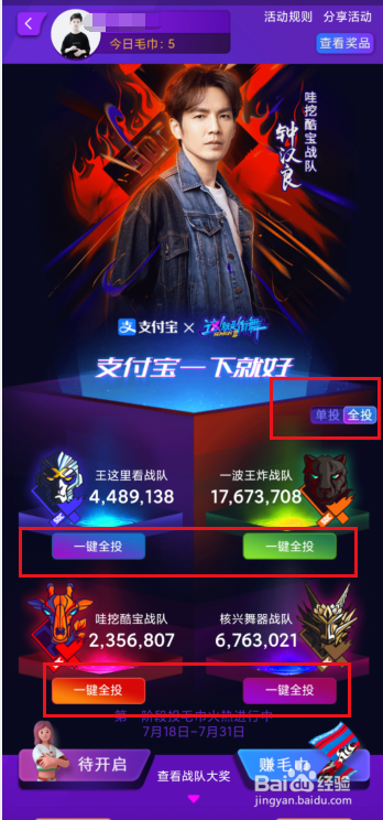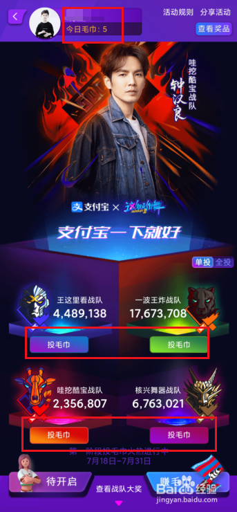 进入活动后在上方就会有今日的毛巾数目,可以直接投票给各个战队。