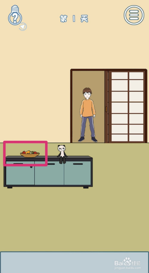 进入游戏的第一关后,首先,需要点击放在茶几上的那个果盘,取走果盘里的生果。