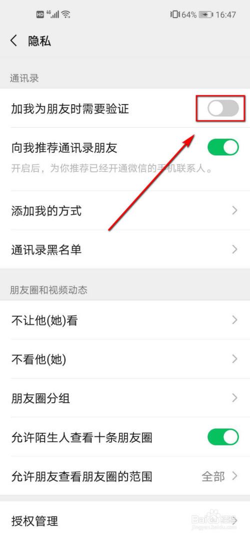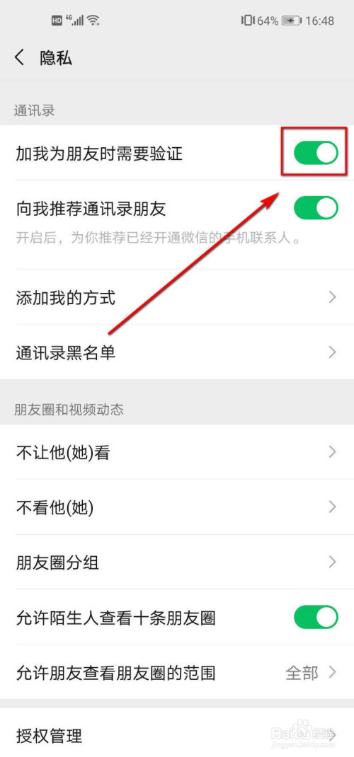 进入隐私页面后,我们需要开通【加我为老友时需要验证】功能,才可以杜绝目生人直接添加我们为老友,顺带将我们拉进目生的群。