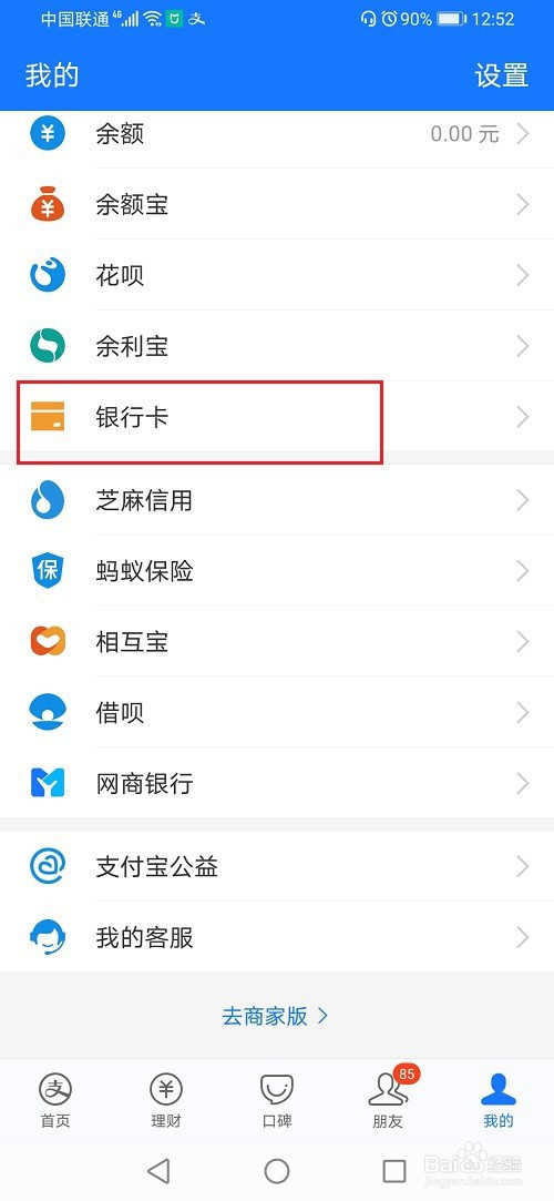 第二步下面来绑定一下银行卡,打开支付宝,进去我的界面,点击银行卡