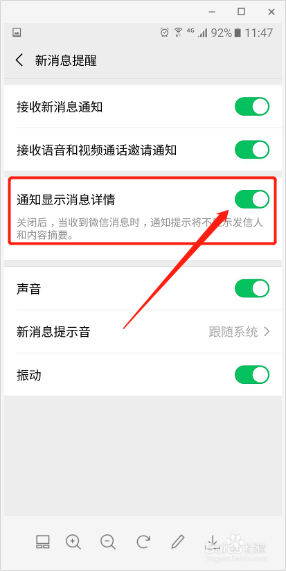 在新动静提醒页面,有一个【通知显示动静详情】,默认是打开的