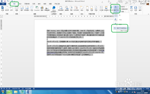 选中文字,在东西栏上点击【插入】,首字下沉下面的【首字下沉选项】,如图。
