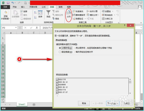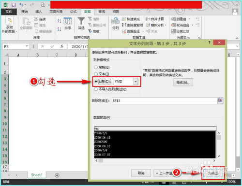随后,在“文天职列标的目的导第3步”的操作界面中,我们勾选“日期”选项,并选择软件默认的“YMD”(年代日)格局。最后再单击“完当作”选项。如图所示: