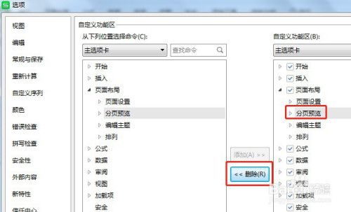 在右边的自界说功能区里面选中【页面结构】里面的【分页预览】,然后点击【删除】