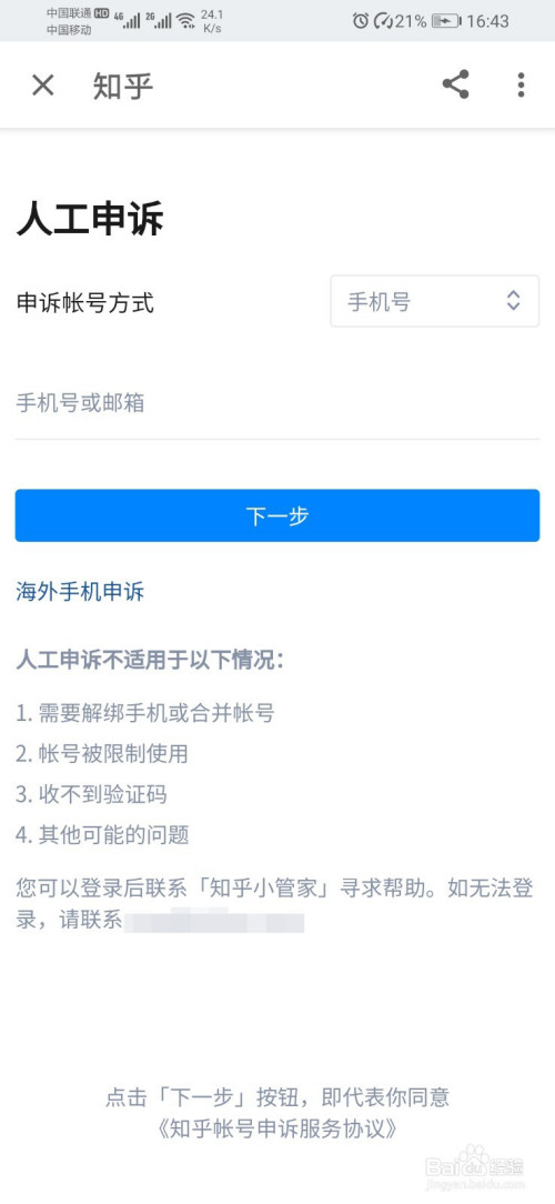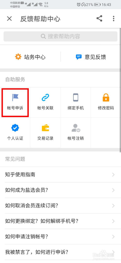 - 打开后,点击“账号申诉”。