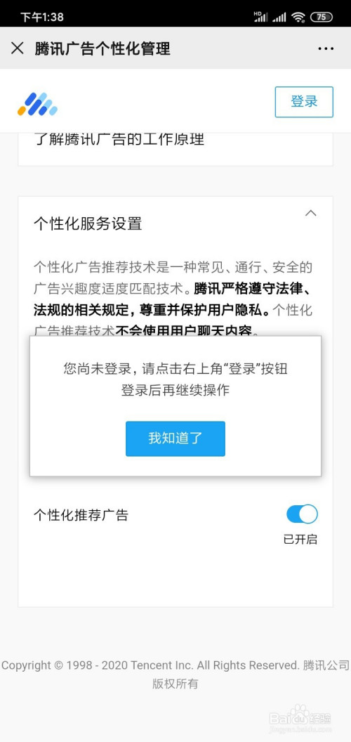 进入腾讯告白个性化办理页面,翻至最下方,点击个性化保举告白开关,点击后会提醒用户登录,登录微信账号,再次封闭即可。