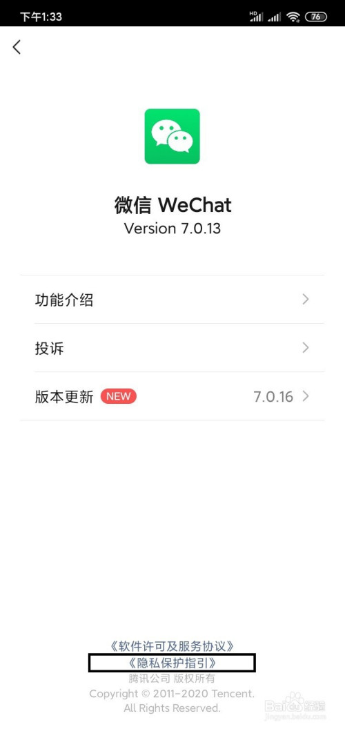 点击关于微信,并点击该页面下的蓝字《隐私庇护指引》,在图中框选位置。