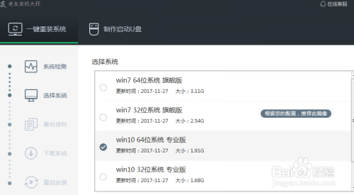接下来,老友装机巨匠会扫描电脑设置装备摆设并列出系统,我们按照本身电脑的环境选择安装的系统。