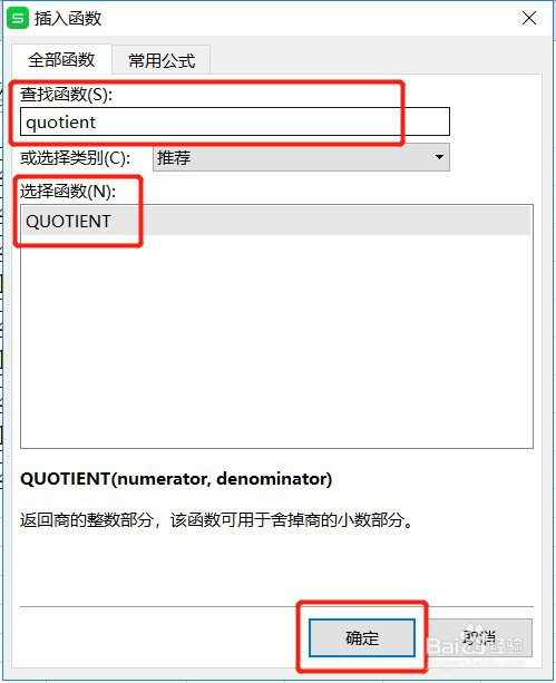 在查找函数框里面输入:quotient