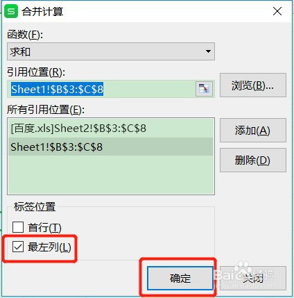 在弹出来的归并计较页面,引用位置拔取第一个表格的数据表,点击【添加】